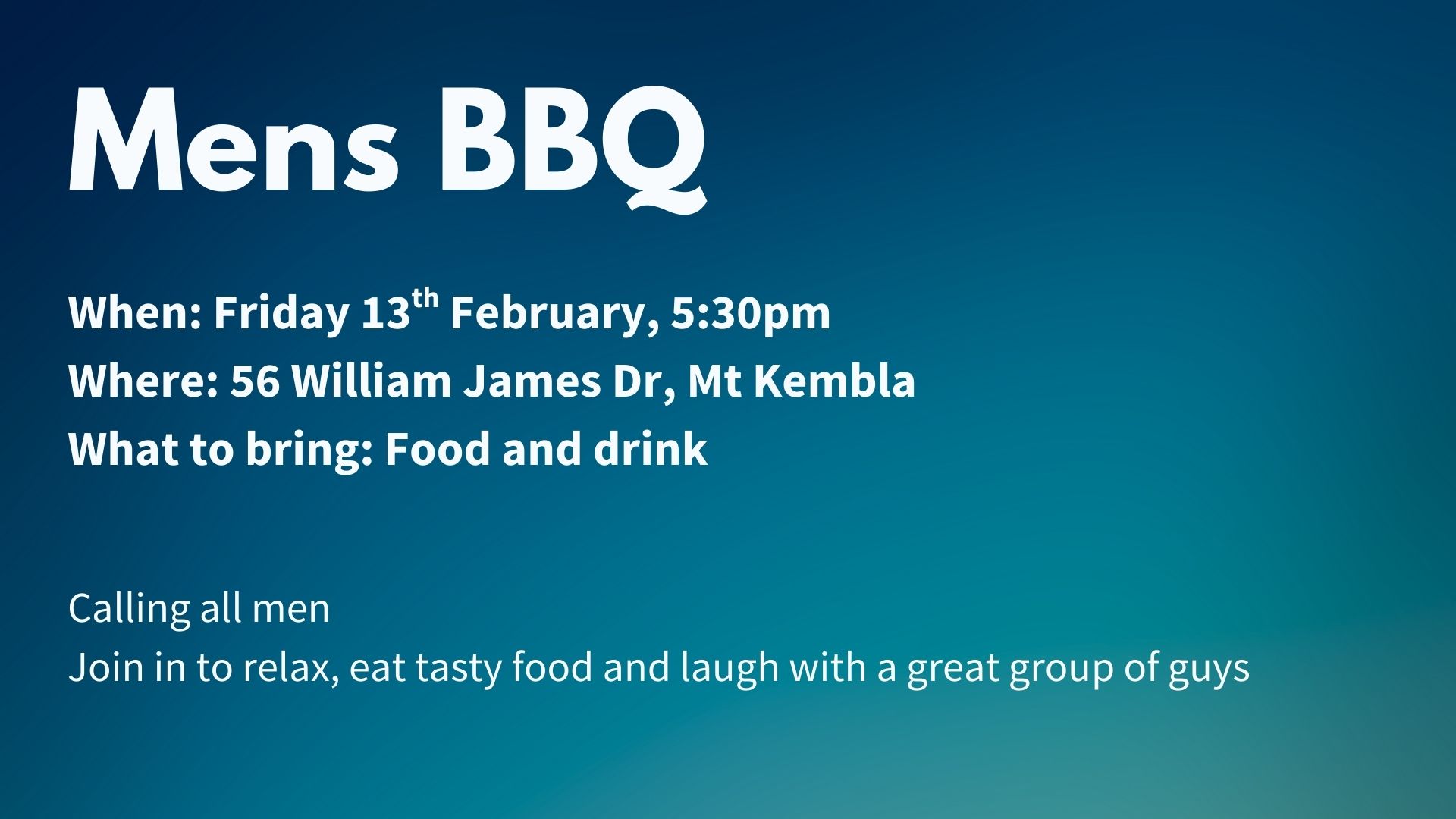 When: Friday 13th February, 5:30pmWhere: 56 William James Dr, Mt KemblaWhat to bring: Food and…